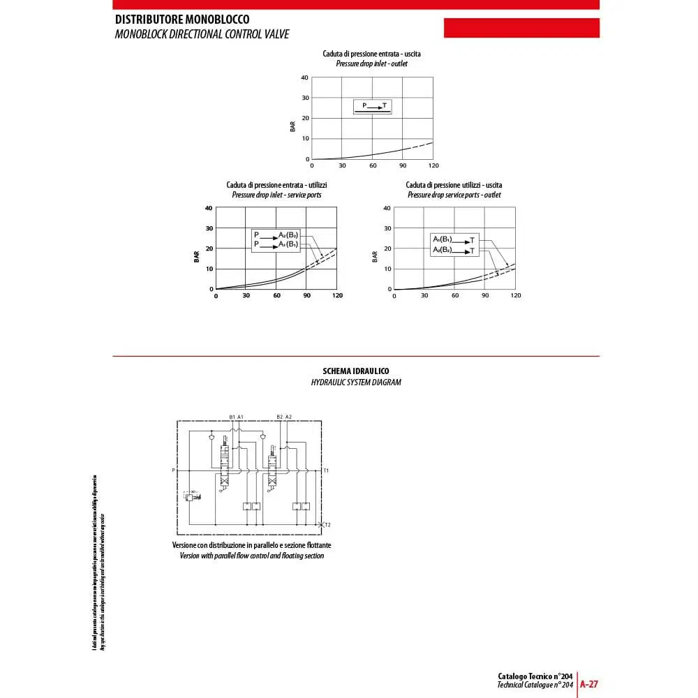 2 section monoblock directional control valve with floating section suitable for hydraulic systems with fixed displacement pumps (open centre circuit) applications: front-end loader.
